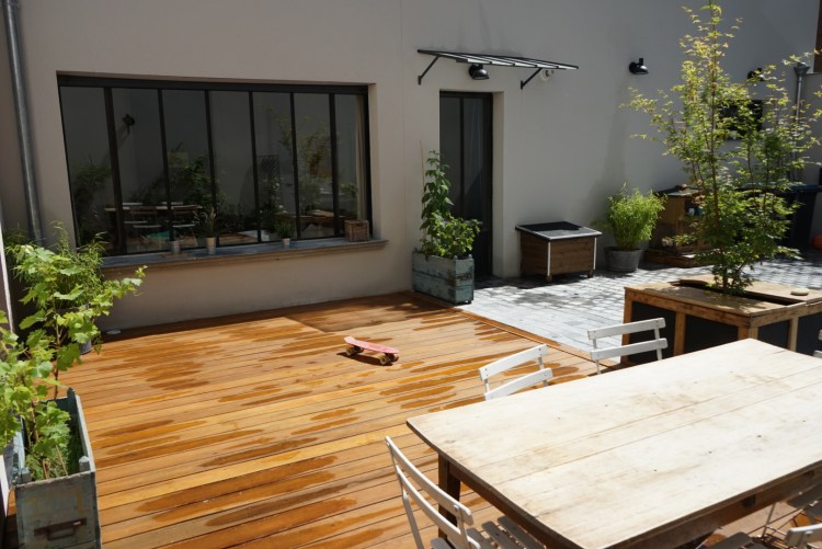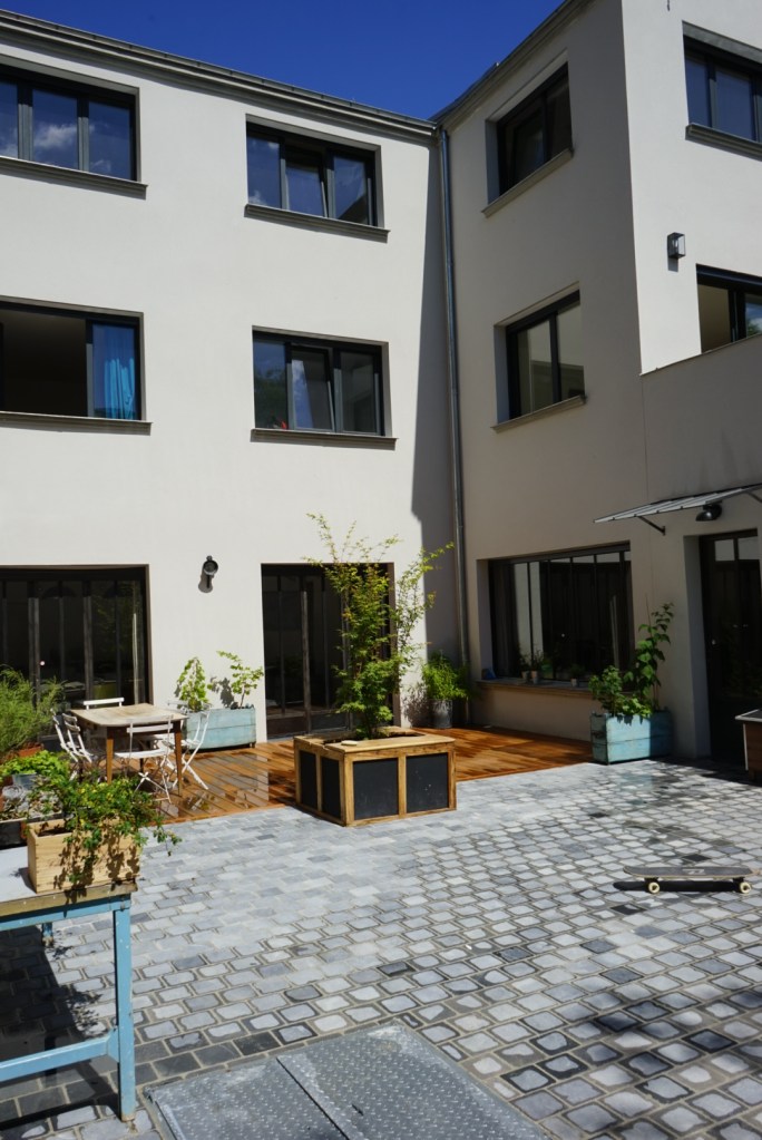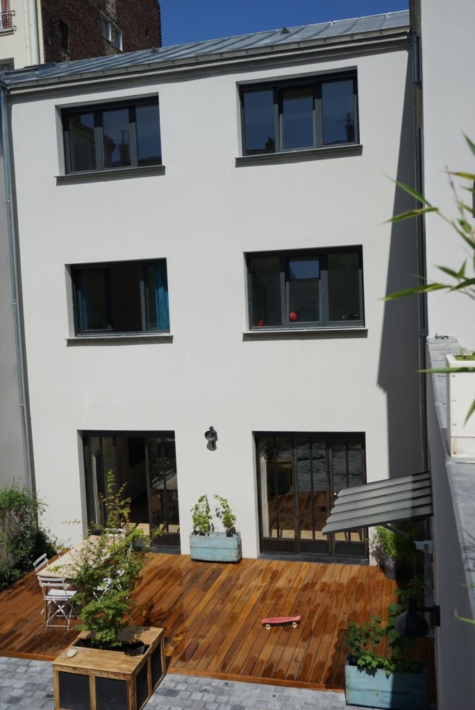 Transformation d’un hangar industriel en une grande maison d’habitation avec cour arborée, un duplex avec terrasse, un studio et un local de stockage.
