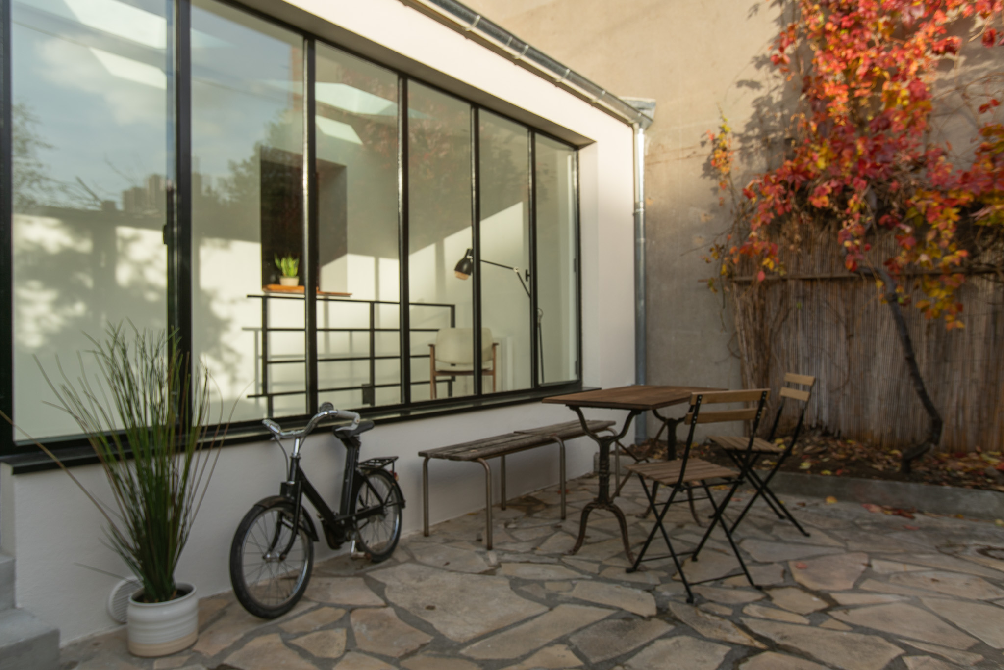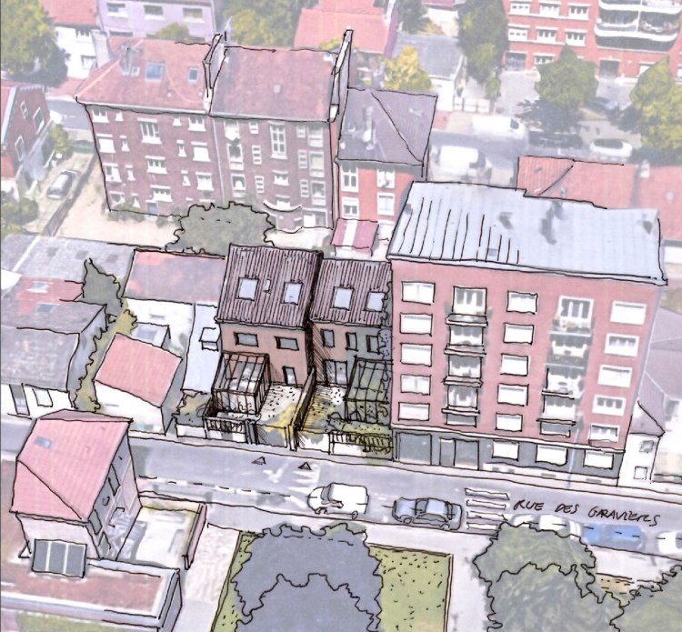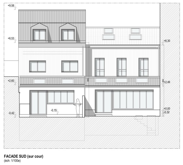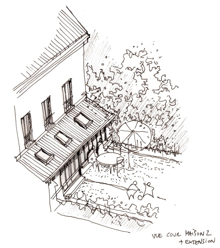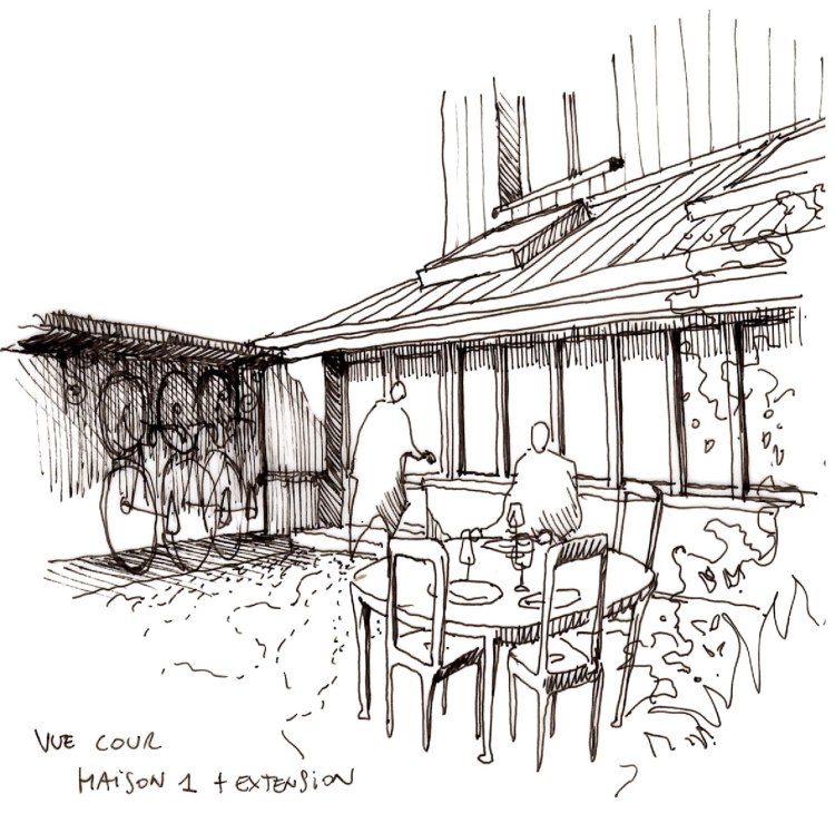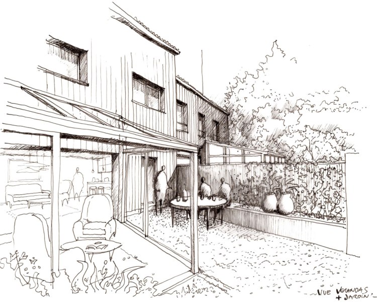 Création de deux villas indépendantes de 85 m² chacune, assorties de vérandas ouvrant sur une grande cour arborée.